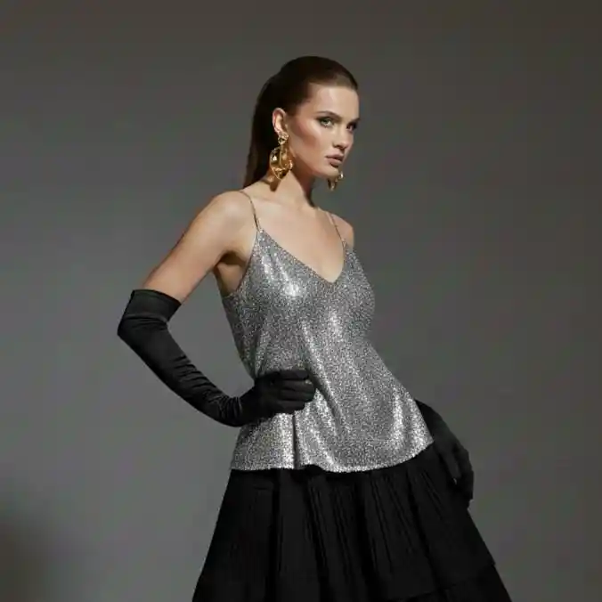 Top de Lentejuelas Gris Un top casual con actitud. Su base relajada se combina con una cobertura completa de lentejuelas grises que lo convierten en una pieza llamativa y versátil al mismo tiempo. Es perfecto para quienes quieren brillar sin perder comodidad. Puedes combinarlo con jeans para un contraste urbano o con prendas más estructuradas para un look nocturno. Es ese equilibrio entre sencillo y protagonista.