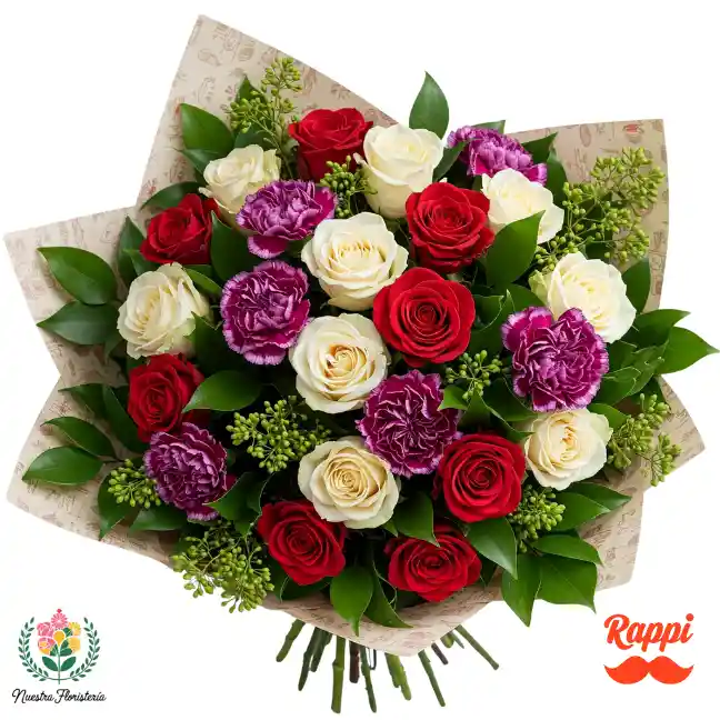 Es un ramo que celebra la belleza natural y desenfadada. Una mezcla encantadora de rosas rojas, blancas y amarillas se distribuyen de forma irregular, creando una sensación orgánica y espontánea. Los claveles morados y blancos añaden una textura interesante y un aire bohemio, mientras que una variedad de follajes verdes con distintas formas y texturas realzan su aspecto silvestre y romántico, como recién recolectado de un jardín encantado.