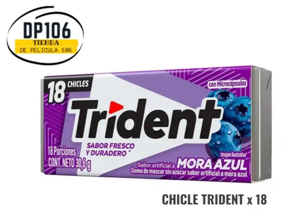 Goma de mascar Trident sabor Mora Azul. Sin azúcar, con un sabor vibrante y refrescante en un práctico empaque.