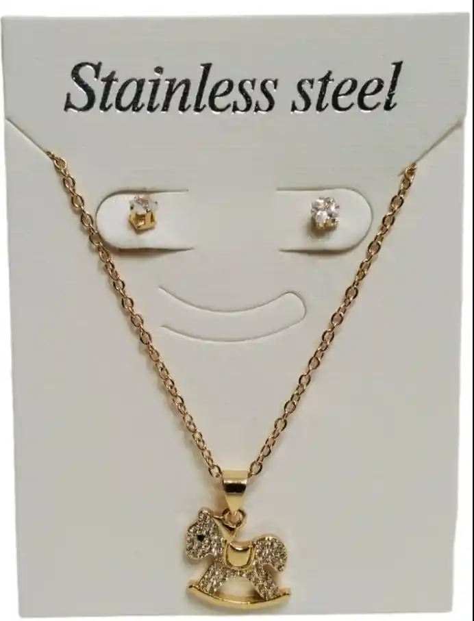 Trio En Acero Cadena, Dije Y Aretes Diseño Caballo De Juguete Con Piedras Brillantes