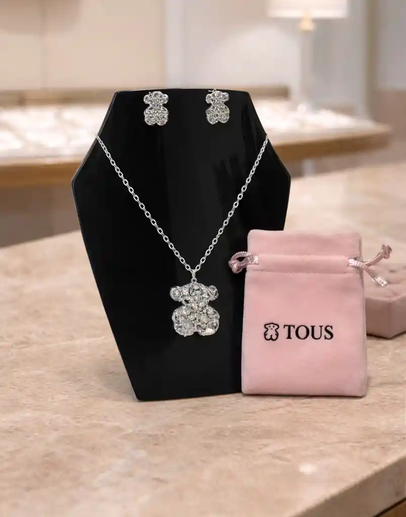 ✨ Trío Plata Ley 925 Oso Plateado Doble Corazón + Bolsa de Lujo ✨