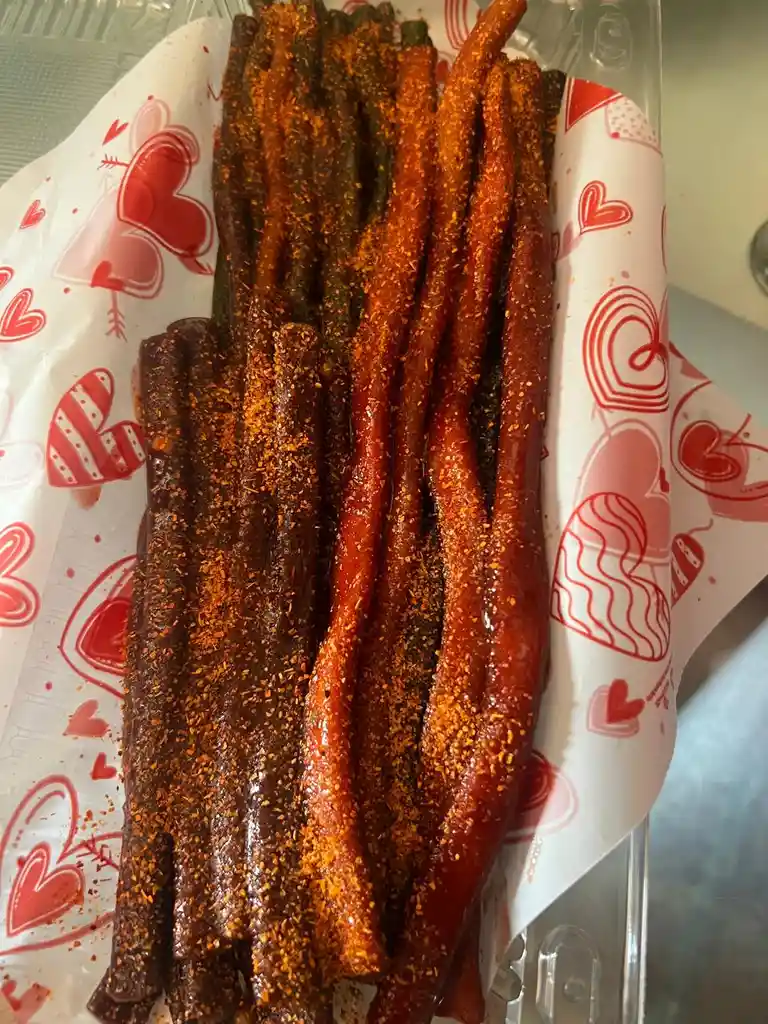 Cables dulces bañados en chamoy y chilito.