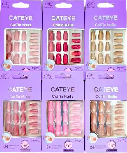 Juego por 24 piezas, escoge el color que desee. PREPARACIÓN : Limpia las uñas con removedor de esmalte y lava bien las manos con jabón. Selecciona el tamaño correcto de uña para cada dedo y colócalas en orden. Las uñas están numeradas el número se encuentra debajo de cada uña. APLICACIÓN CON TABS ADHESIVOS Las uñas y los tabs adhesivos tienen tamaños correspondientes. Selecciona el tab adhesivo que coincida con el tamaño de la uña elegida y despega la lámina protectora. Aplica el tab adhesivo sobre la uña natural, presiona y alisa retira la película protectora. Alinea la uña con la cutícula y presiona firmemente comenzando por el centro y luego por los lados. TIP PROFESIONAL: Para una mayor duración, presiona las uñas varias veces. Evita el contacto con el agua durante la primera hora. REMOCIÓN: Aplica removedor de esmalte alrededor de los bordes, espera 1 minuto y despega suavemente la uña desde los lados. APLICACIÓN CON PEGANTE (GLUE APPLICATION) Aplica pegante en la parte posterior de la uña artificial. Aplica pegante sobre la uña natural. Alinea con la cutícula, presiona suavemente y mantén presionado por 5 segundos. TIP PROFESIONAL: Aplica suficiente pegante para evitar burbujas de aire, asegurar la adhesión y prolongar la duración. REMOCIÓN: Lima la superficie para romper la capa protectora. Remoja las uñas en removedor de uñas artificiales o acetona hasta que se ablanden. Retira el exceso de pegante suavemente. No fuerces ni arranques las uñas. ADVERTENCIA: PELIGRO. El cianoacrilato une piel y ojos en segundos. Mantener fuera del alcance de los niños. Puede causar irritación en la piel y severa irritación ocular. Puede causar irritación respiratoria. Mantener alejado de los ojos. EN CASO DE CONTACTO CON LOS OJOS: enjuagar cuidadosamente con agua y buscar atención médica. Usar solo según las indicaciones. Lavar la piel si ocurre contacto accidental. PREP: Clean nails with polish remover and wash hands thoroughly with soap. Select the correct size nail for each finger and set aside in order. Nails are sized by number, noted underneath each nail. ADHESIVE TAB APPLICATION Nails and adhesive tabs have coordinating sizes. Select adhesive tab that coordinates with selected nail size & peel off sheet. Apply adhesive tab to natural nail, press & smooth peel off film. Align nail with cuticle and press down firmly starting in the middle, then each side. EXPERT TIP: For best wear, press nails down several times. Avoid contact with water for the first hour. REMOVAL: Apply polish remover around edges, wait 1 minute and gently peel off nail from sides. GLUE APPLICATION Apply glue to back of artificial nail. Apply glue to natural nail. Align with cuticle, gently press on & hold for 5 seconds. EXPERT TIP: Apply enough glue to avoid air pockets, secure adhesion, and extend wear. REMOVAL: Trim & file surface to disrupt protective top coat. Soak nails in Artificial Nail Remover or acetone polish remover until soft. Wipe off softened nails & glue. Do not force or pull nails off. WARNING: CYANOACRYLATE DANGER. BONDS SKIN AND EYES IN SECONDS. KEEP OUT OF THE REACH OF CHILDREN. Causes skin irritation. Causes serious eye irritation. May cause respiratory irritation. Keep away from eyes. IF IN EYES: Rinse cautiously with water. Seek medical attention. Use only as directed. Wash skin if incidental contact occurs.