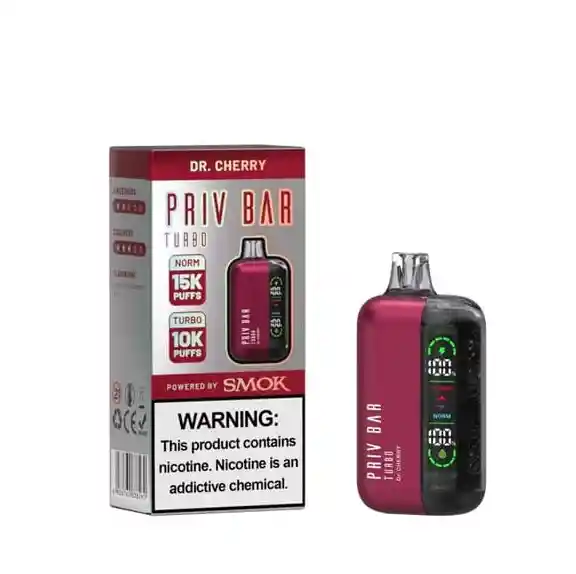 Vaporizador desechable de Priv Bar Turbo 15.000 Puffs de 5% (50mg) de cereza Modo normal: 15.000 puffs Modo turbo: 10.000 puffs -Indicador de batería -Indicador de liquido -Recargable en batería