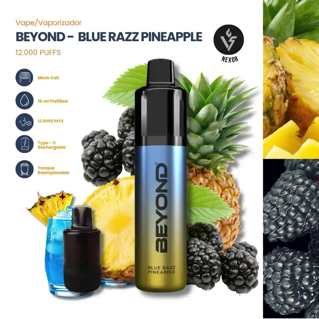 Una explosión tropical donde la frambuesa azul golpea primero con ese toque ácido y dulce, y luego entra la piña jugosa para suavizarlo con vibra playera. Es como un cóctel frío en la playa: intenso, refrescante y adictivo desde la primera calada. Características principales • Hasta 12,000 puffs en total (6000 + 6000 del tanque adicional) • Batería recargable • Puerto de carga Tipo C (rápido y práctico) • Sistema con tanque adicional incluido (extiende la duración) • Tecnología mesh coil (mejor sabor y vapor más uniforme)
