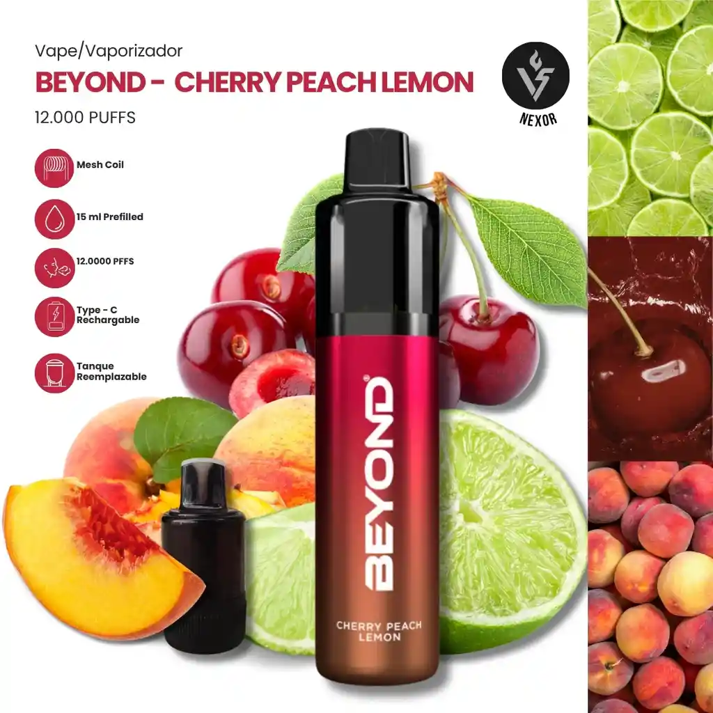 Una mezcla que juega con contrastes: la cereza dulce y profunda, el durazno suave y el limón que le da ese punch ácido al final. Es como un jugo frutal premium con capas de sabor que van cambiando en cada calada. Intenso, jugoso y súper envolvente. Características principales • Hasta 12,000 puffs en total (6000 + 6000 del tanque adicional) • Batería recargable • Puerto de carga Tipo C (rápido y práctico) • Sistema con tanque adicional incluido (extiende la duración) • Tecnología mesh coil (mejor sabor y vapor más uniforme)