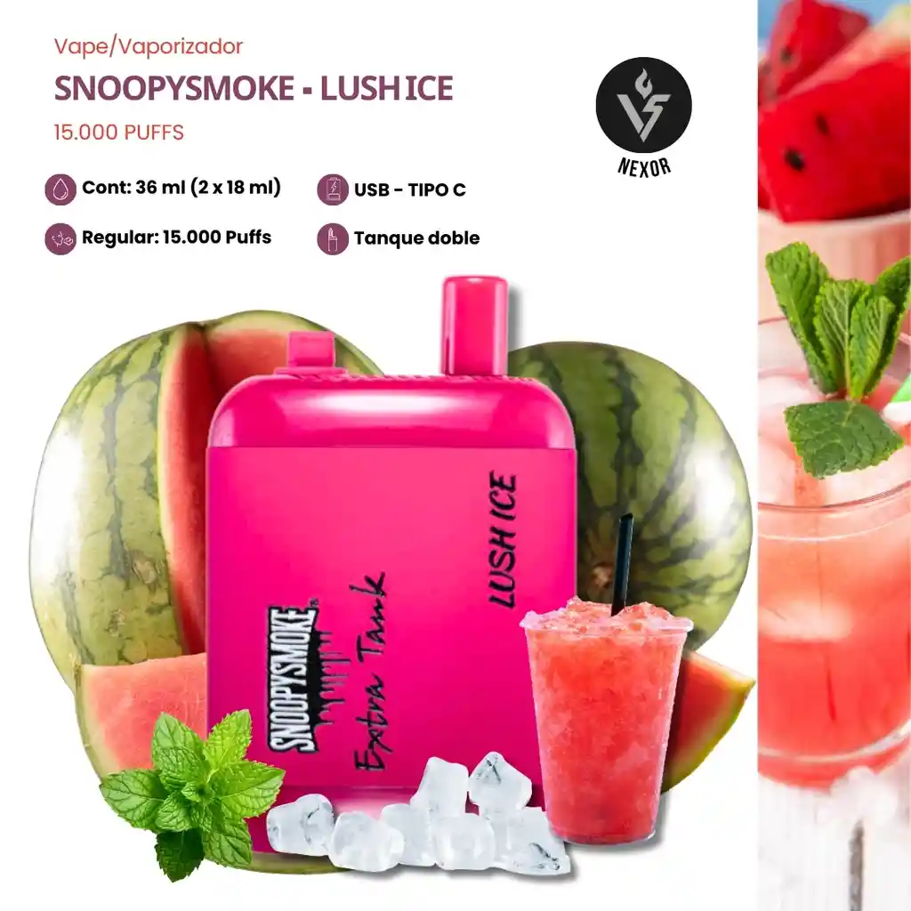 Sandía dulce + Ice suave 🍉❄️ y vapor abundante con +15000 puffs. Lush Ice ofrece una sandía dulce con frescura suave y agradable 🙂↔️⭐ Gracias al Extra Tank, duplica su duración cambiando la boquilla al segundo depósito. Incluye 36 ml, 50 mg, batería USB-C y +15.000 puffs con vapor denso y constante. Ideal para quienes buscan un sabor dulce pero refrescante.
