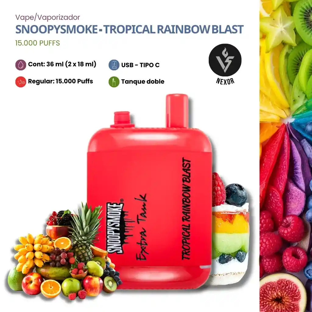 El Snoopy Smoke 15K Tropical Rainbow Blast combina frutas tropicales dulces, ácidas y exóticas, creando un sabor colorido y equilibrado. 🌈🍍 Gracias a su sistema Extra Tank, ofrece doble duración real: cambia de boquilla cuando el primer tanque se agote. Con 36 ml totales, 50 mg de nicotina y +15.000 puffs, este vape desechable entrega un vapor suave, dulce y muy aromático. Su batería 650 mAh USB-C mantiene el rendimiento constante. Perfecto para los amantes de los sabores frutales premium 🙂↔️