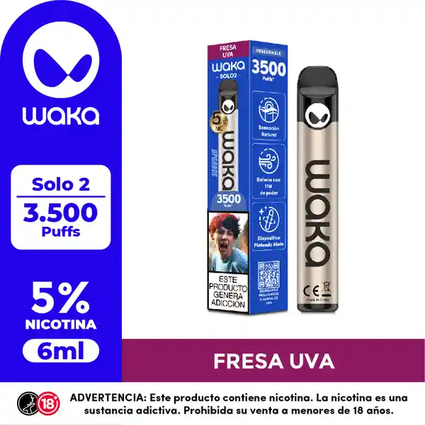 WAKA SOLO 2: vapeador desechable sabor fresa y uva. Contiene 5% de nicotina; capacidad de e-líquido: 6 ml. Dis...Ver más