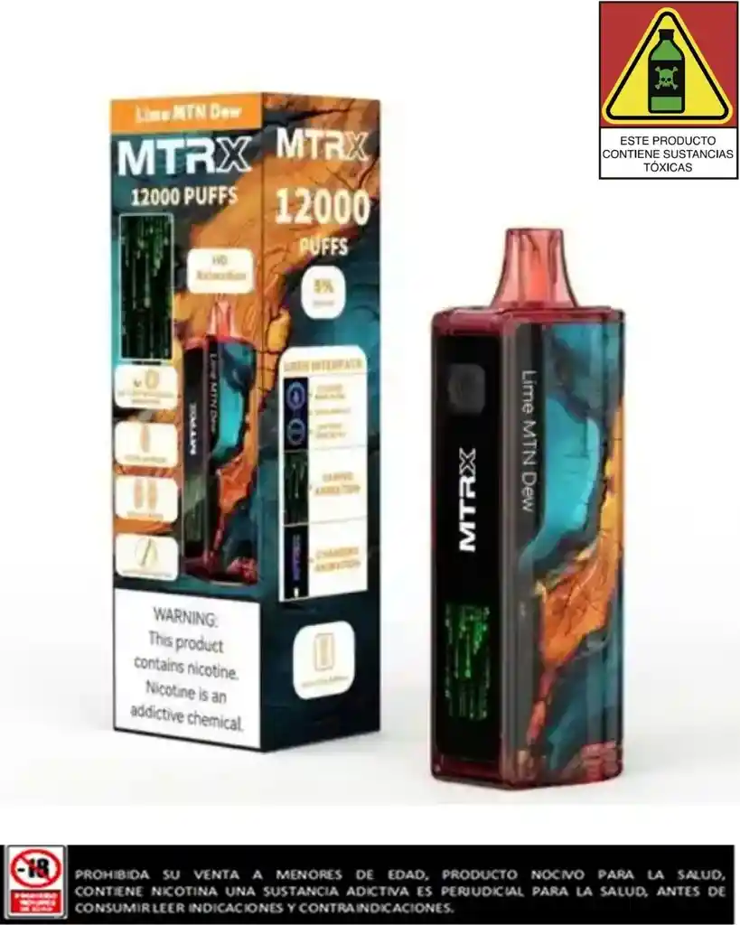 El vapeador MTRX 12.000 Puffs es un dispositivo desechable diseñado para ofrecer una experiencia de vapeo prolongada y personalizable. Cuenta con dos modos de vapeo, una pantalla animada y una bobina de malla doble que optimiza el sabor y la producción de vapor. Características técnicas Capacidad de e-líquido: 15 ml de e-líquido precargado, con una concentración de nicotina del 5% (50 mg). Modos de vapeo: Modo Regular: Ofrece aproximadamente 12.000 caladas. Modo Turbo/Boost: Proporciona un impulso en la producción de vapor, lo que reduce la duración a unas 6.000 caladas. Bobina: Posee una bobina de malla doble que mejora el sabor y el rendimiento, y se puede alternar entre bobina sencilla y doble con un solo clic. Batería: Incluye una batería recargable de 650 mAh, que se carga rápidamente a través de un puerto USB-C. Pantalla animada: Incorpora una pantalla HD que muestra el nivel de batería, el nivel de e-líquido y el modo de vapeo activo, además de animaciones de vapeo y carga. Flujo de aire: Permite ajustar el flujo de aire para personalizar la experiencia, según la preferencia del usuario. Activación: Se activa de forma automática al inhalar.
