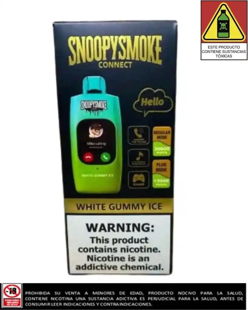 El sabor White Gummy Ice del vapeador Snoopy Smoke Connect 30.000 Puffs está inspirado en los clásicos caramelos de gomita blancos, que suelen tener sabor a piña. Se combina con un toque de frescor mentolado ("Ice") para crear una experiencia de vapeo refrescante. Perfil de sabor Sabor a piña: El componente principal del sabor evoca el sabor dulce y ligeramente ácido de la piña, como el de los ositos de gomita blancos. Toque mentolado: El "Ice" añadido proporciona una sensación fresca y helada en cada calada, lo que equilibra el dulzor de la piña y hace el sabor menos empalagoso. Caramelo de gomita: Tiene la dulzura característica de los caramelos de gomita, aportando una nota nostálgica y acentuando la mezcla frutal. Características del vapeador Además del sabor, el dispositivo Snoopy Smoke Connect 30.000 Puffs ofrece: Gran capacidad: 20 ml de e-líquido con nicotina al 5%. Conectividad inteligente: Permite conectarse a un teléfono vía Bluetooth para funciones de reloj, música y gestión de llamadas. Pantalla LED: Muestra el nivel de batería y e-líquido. Bobina de malla: Optimiza la intensidad del sabor. Flujo de aire ajustable: Permite personalizar la experiencia de vapeo.