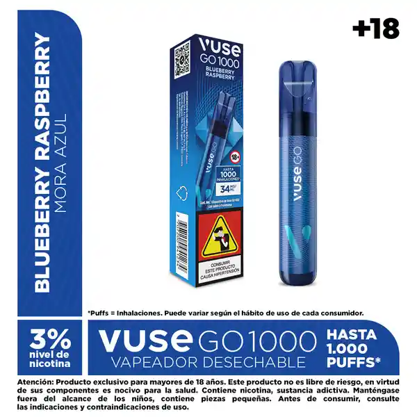 Atención: Producto exclusivo para mayores de 18 años Este producto no es libre de riesgo, en virtud de sus componentes es nocivo para la salud. Contiene nicotina, sustancia adictiva. Manténgase fuera del alcance de los niños, contiene piezas pequeñas. Antes de consumir, consulte las indicaciones y contraindicaciones de uso. Desde el 21 de julio de 2025 productores e importadores estarán obligados a comercializar sus productos con los pictogramas y advertencias sanitarias establecidas por el Ministerio de Salud. Por lo anterior, coexistirán en los puntos de venta y/o entregas a domicilio empaques de producto con o sin advertencia sanitaria, hasta que estos últimos sean comercializados en su totalidad. La presente comunicación se publica en cumplimiento de lo dispuesto en los artículos 3 (numeral 1.3) y 23 a 28 del Estatuto del Consumidor (Ley 1480 de 2011), suministra información clara, suficiente, veraz y oportuna. El contenido aquí publicado no tiene fines promocionales ni publicitarios.Ingredientes: propilenglicol, glicerina vegetal, saborizante artificial de frambuesa, nicotina (sustancia adictiva y nociva para la salud), ácido benzoico, ácido láctico, agua, alcohol bencílico y damascenona (beta-). Empaque con 1 dispositivo de Vuse GO 1000. Cont. Net. de líquido vaporizable: 2 ml. Contenido de nicotina por dispositivo: 68 mg. Intensidad total de nicotina (administración de dosis): 34 mg/ml, equivalente al 3% del contenido neto del dispositivo.