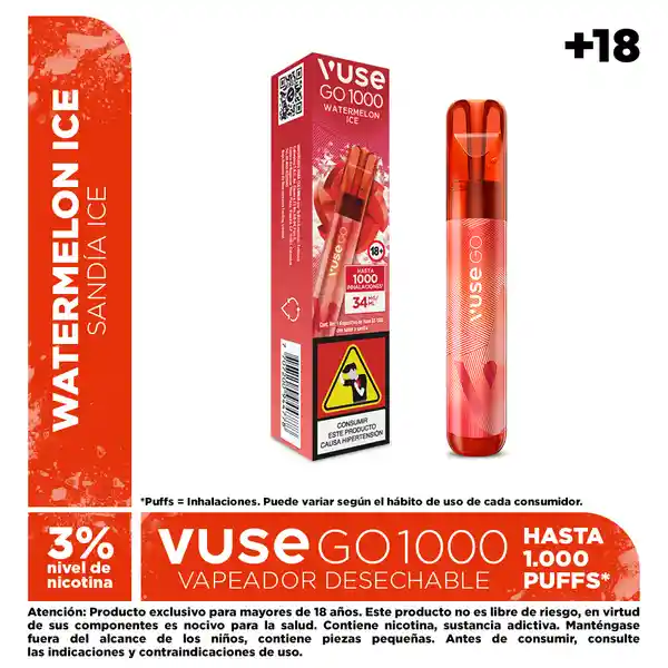 Atención: Producto exclusivo para mayores de 18 años Este producto no es libre de riesgo, en virtud de sus componentes es nocivo para la salud. Contiene nicotina, sustancia adictiva. Manténgase fuera del alcance de los niños, contiene piezas pequeñas. Antes de consumir, consulte las indicaciones y contraindicaciones de uso. Desde el 21 de julio de 2025 productores e importadores estarán obligados a comercializar sus productos con los pictogramas y advertencias sanitarias establecidas por el Ministerio de Salud. Por lo anterior, coexistirán en los puntos de venta y/o entregas a domicilio empaques de producto con o sin advertencia sanitaria, hasta que estos últimos sean comercializados en su totalidad. La presente comunicación se publica en cumplimiento de lo dispuesto en los artículos 3 (numeral 1.3) y 23 a 28 del Estatuto del Consumidor (Ley 1480 de 2011), suministra información clara, suficiente, veraz y oportuna. El contenido aquí publicado no tiene fines promocionales ni publicitarios.Ingredientes: propilenglicol, glicerina vegetal, saborizante artificial de sandía, nicotina (sustancia adictiva y nociva para la salud), ácido benzoico, ácido láctico, agua, alcohol bencílico, furaneol y linalool. Empaque con 1 dispositivo de Vuse GO 1000. Cont. Net. de líquido vaporizable: 2 ml. Contenido de nicotina por dispositivo: 68 mg. Intensidad total de nicotina (administración de dosis): 34 mg/ml, equivalente al 3% del contenido neto del dispositivo.