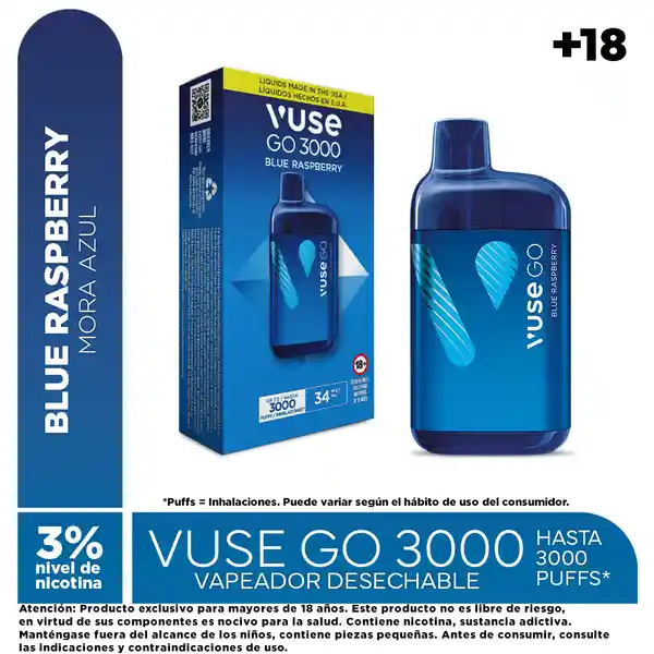 Atención: Producto exclusivo para mayores de 18 años Este producto no es libre de riesgo, en virtud de sus componentes es nocivo para la salud. Contiene nicotina, sustancia adictiva. Manténgase fuera del alcance de los niños, contiene piezas pequeñas. Antes de consumir, consulte las indicaciones y contraindicaciones de uso. Desde el 21 de julio de 2025 productores e importadores estarán obligados a comercializar sus productos con los pictogramas y advertencias sanitarias establecidas por el Ministerio de Salud. Por lo anterior, coexistirán en los puntos de venta y/o entregas a domicilio empaques de producto con o sin advertencia sanitaria, hasta que estos últimos sean comercializados en su totalidad. La presente comunicación se publica en cumplimiento de lo dispuesto en los artículos 3 (numeral 1.3) y 23 a 28 del Estatuto del Consumidor (Ley 1480 de 2011), suministra información clara, suficiente, veraz y oportuna. El contenido aquí publicado no tiene fines promocionales ni publicitarios.Ingredientes: propilenglicol, glicerina vegetal, saborizante artificial de frambuesa, nicotina, ácido benzoico, ácido láctico, agua, alcohol bencílico y damascenona (beta-). Empaque con 1 dispositivo de Vuse GO 3000. Cont. Net. de líquido vaporizable: 8 ml. Contenido de nicotina: 272 mg. Intensidad total de nicotina (administración de dosis): 34 mg/ml, equivalente al 3% del contenido neto del dispositivo.