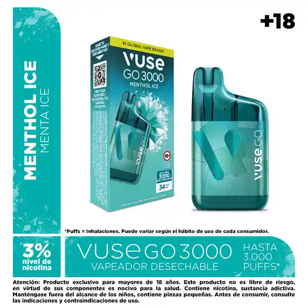 Atención: Producto exclusivo para mayores de 18 años Este producto no es libre de riesgo, en virtud de sus componentes es nocivo para la salud. Contiene nicotina, sustancia adictiva. Manténgase fuera del alcance de los niños, contiene piezas pequeñas. Antes de consumir, consulte las indicaciones y contraindicaciones de uso. Desde el 21 de julio de 2025 productores e importadores estarán obligados a comercializar sus productos con los pictogramas y advertencias sanitarias establecidas por el Ministerio de Salud. Por lo anterior, coexistirán en los puntos de venta y/o entregas a domicilio empaques de producto con o sin advertencia sanitaria, hasta que estos últimos sean comercializados en su totalidad. La presente comunicación se publica en cumplimiento de lo dispuesto en los artículos 3 (numeral 1.3) y 23 a 28 del Estatuto del Consumidor (Ley 1480 de 2011), suministra información clara, suficiente, veraz y oportuna. El contenido aquí publicado no tiene fines promocionales ni publicitarios.Ingredientes: propilenglicol, glicerina vegetal, saborizante artificial de menta, nicotina, ácido benzoico, ácido láctico, agua, alcohol bencílico y l-carvona. Empaque con 1 dispositivo de Vuse GO 3000. Cont. Net. de líquido vaporizable: 8 ml. Contenido de nicotina: 272 mg. Intensidad total de nicotina (administración de dosis): 34 mg/ml, equivalente al 3% del contenido neto del dispositivo.