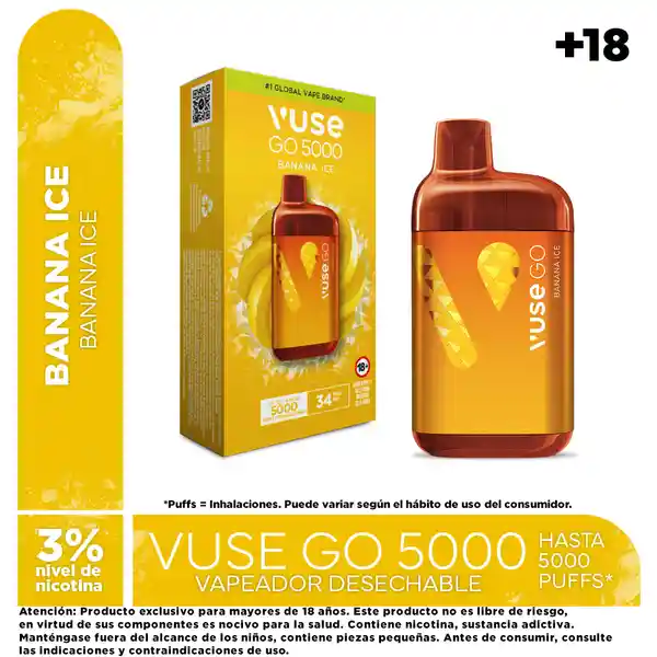 Atención: Producto exclusivo para mayores de 18 años Este producto no es libre de riesgo, en virtud de sus componentes es nocivo para la salud. Contiene nicotina, sustancia adictiva. Manténgase fuera del alcance de los niños, contiene piezas pequeñas. Antes de consumir, consulte las indicaciones y contraindicaciones de uso. Desde el 21 de julio de 2025 productores e importadores estarán obligados a comercializar sus productos con los pictogramas y advertencias sanitarias establecidas por el Ministerio de Salud. Por lo anterior, coexistirán en los puntos de venta y/o entregas a domicilio empaques de producto con o sin advertencia sanitaria, hasta que estos últimos sean comercializados en su totalidad. La presente comunicación se publica en cumplimiento de lo dispuesto en los artículos 3 (numeral 1.3) y 23 a 28 del Estatuto del Consumidor (Ley 1480 de 2011), suministra información clara, suficiente, veraz y oportuna. El contenido aquí publicado no tiene fines promocionales ni publicitarios.Ingredientes: propilenglicol, glicerina vegetal, saborizante artificial de banana, nicotina, ácido benzoico, ácido láctico, agua y alcohol bencílico. Empaque con 1 dispositivo de Vuse GO 5000. Cont. Net. de líquido vaporizable: 10 ml. Contenido de nicotina: 340 mg. Intensidad total de nicotina (administración de dosis): 34 mg/ml, equivalente al 3% del contenido neto del dispositivo.