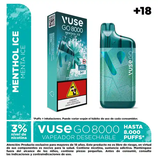 Atención: Producto exclusivo para mayores de 18 años Este producto no es libre de riesgo, en virtud de sus componentes es nocivo para la salud. Contiene nicotina, sustancia adictiva. Manténgase fuera del alcance de los niños, contiene piezas pequeñas. Antes de consumir, consulte las indicaciones y contraindicaciones de uso. Desde el 21 de julio de 2025 productores e importadores estarán obligados a comercializar sus productos con los pictogramas y advertencias sanitarias establecidas por el Ministerio de Salud. Por lo anterior, coexistirán en los puntos de venta y/o entregas a domicilio empaques de producto con o sin advertencia sanitaria, hasta que estos últimos sean comercializados en su totalidad. La presente comunicación se publica en cumplimiento de lo dispuesto en los artículos 3 (numeral 1.3) y 23 a 28 del Estatuto del Consumidor (Ley 1480 de 2011), suministra información clara, suficiente, veraz y oportuna. El contenido aquí publicado no tiene fines promocionales ni publicitarios.Ingredientes: propilenglicol, glicerina vegetal, saborizante artificial de menta, nicotina (producto adictivo y nocivo para la salud), ácido benzoico, ácido láctico, agua, alcohol bencílico y l-carvona. Empaque con 1 dispositivo de Vuse GO 8000. Cont. Net. de líquido vaporizable: 15 ml. Contenido de nicotina por dispositivo: 510 mg. Intensidad total de nicotina (administración de dosis): 34 mg/ml, equivalente al 3% del contenido neto del dispositivo.