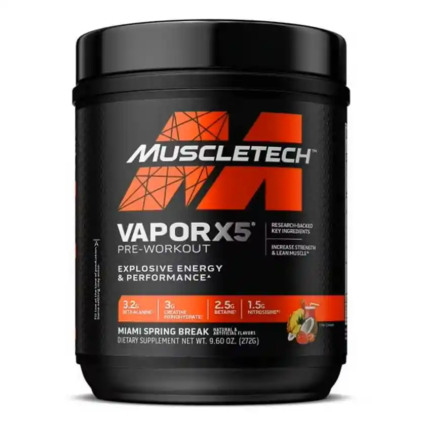 VAPOR X5 PRE-WORKOUT ¿Buscas mejorar tu rendimiento en el entrenamiento y llevar tu condición física al siguiente nivel? ¡MuscleTech Vapor X5 podría ser justo lo que necesitas! Este suplemento pre-entrenamiento está especialmente diseñado para ayudar a aumentar la energía, la concentración y la resistencia, para que puedas superar tus sesiones de entrenamiento más duras. Aumente el óxido nítrico y sus objetivos generales de entrenamiento con esta poderosa combinación de ingredientes, que incluyen cafeína, beta-alanina y taurina, Vapor X5 puede ayudarlo a superar sus límites y alcanzar sus objetivos de acondicionamiento físico. Ya seas un atleta experimentado o recién estés comenzando, MuscleTech Vapor X5 podría ser la clave para desbloquear todo tu potencial en el gimnasio. 3200 mg BETA-ALANINA‡ Produce carnosina, que se encuentra naturalmente en el cuerpo. Reduce la acumulación de ácido láctico para combatir la fatiga muscular y mejorar el rendimiento durante el entrenamiento intenso. 3.000 mg MONOHIDRATO DE CREATINA‡ La creatina se encuentra naturalmente en las células musculares y ayuda a los músculos a producir energía durante el levantamiento de objetos pesados o el ejercicio HIIT. 2,5 mg BETAÍNA‡ Producido naturalmente en tu cuerpo. También se encuentra en la remolacha y las espinacas. Le ayuda a desarrollar más músculo y aumentar la fuerza. 1.500 mg NITROSIGINA®‡ Un complejo de ingredientes patentado, diseñado científicamente para aumentar los niveles de óxido nítrico y proporcionar bombas desgarradoras. ‡ Por 2 cucharadas.