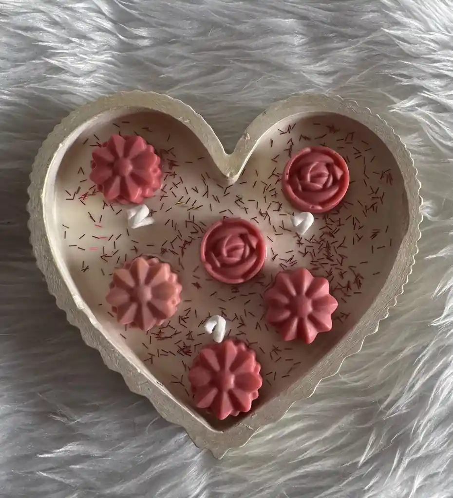 Sorprende con un detalle lleno de dulzura, luz y significado con esta hermosa vela artesanal en bandeja con forma de corazón. Su diseño incorpora delicadas mini velas florales cuidadosamente elaboradas a mano, creando una pieza decorativa elegante y encantadora. Perfecta para ambientar espacios especiales, celebraciones románticas o regalar a alguien importante, esta vela combina armonía visual, calidez y un toque artesanal que la hace única. 💖 Presentación en bandeja decorativa en forma de corazón 🌸 Mini velas florales artesanales con acabados delicados 🕯️ Ideal para decoración, regalos románticos o momentos especiales 🎁 Producto elaborado con dedicación y amor por Arte de Fe