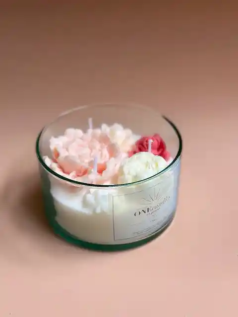 Vela artesanal de 9 oz con flores aromatozadas de cera hechas a mano. Aroma surtido entre nuestros más vendidos (no elegible) Entre ellos se encuentran: Elixir de Manzana, Brisa de Otoño, Lavanda, Pétalos de Rosa, Vainilla Latte, Vainilla Francesa, Ginger Peach, Canela, Naranja Dulce, entre otros. • Cera vegetal · Pabilo de algodón • Hecha a mano en Colombia • Regalo listo para entregar Especificaciones · Dimensiones del envase artesanal: 10 cm de diametro x 5.5 cm de altura • 9 oz (255 g) • Duración: 40–45 horas aprox. Hecha a mano en Colombia con amor ❤️