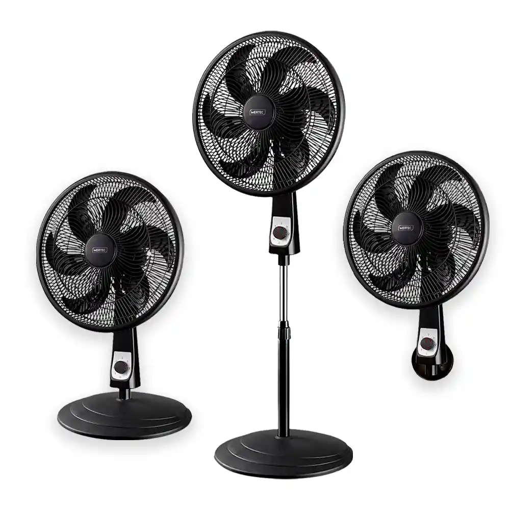 Ventilador 3 en1 Mertec MT-016B Negro El Ventilador 3 en 1 Mertec MT-016B es un dispositivo multifuncional diseñado para ofrecer flexibilidad y comodidad en la ventilación de tu hogar. Este ventilador puede ser utilizado como ventilador de pedestal, de pared o de mesa, adaptándose a diferentes necesidades y espacios. Cuenta con un motor potente de 58 watts que proporciona un flujo de aire eficiente y silencioso. Sus tres velocidades ajustables permiten personalizar la intensidad del aire, mientras que la función de oscilación asegura una distribución uniforme del aire en la habitación. Fabricado con materiales duraderos, como aspas y parrilla de plástico, este ventilador es ligero y fácil de trasladar. Además, su diseño compacto facilita el montaje y el almacenamiento Control de 3 velocidades Ángulo de inclinación ajustable Diámetro 18”