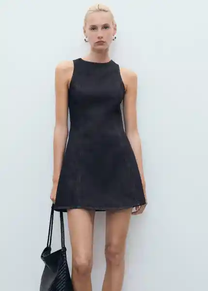 Cierre de Cremallera en la Parte Posterior Cuello Redondo Diseño Corto Diseño Evasé Sin Mangas Tejido de Algodón Estilo Tejano Vaquero Tirantes Anchos - 17083324_Ts.