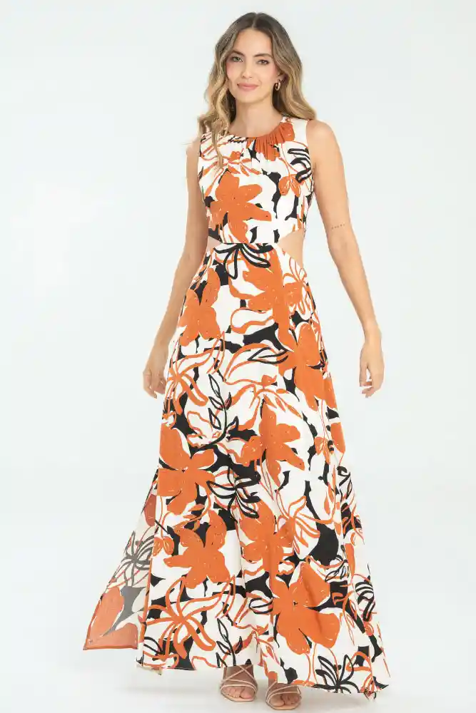 Vestido largo en chalis estampado, escote redondo, manga sisa, ajusta con cierre en espalda, aberturas decorativas en cintura y aberturas en ruedo falda.