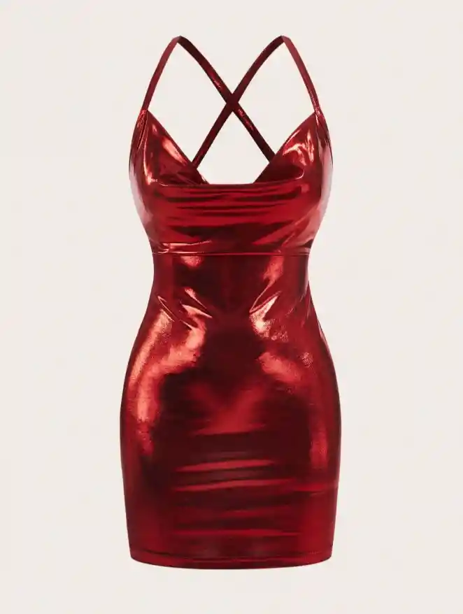 Mini Vestido ajustado sin mangas sexy para mujer. Talla M, Color Rojo. Tela delgada acabado metálico brillante, detalle de tirantes cruzados, mini vestido ajustado, perfecto para fiestas y eventos, cintura ajustada, ropa de fiesta. Brillo metálico | Poliéster