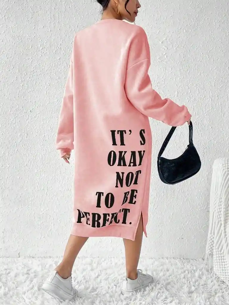 Vestido de Sudadera Casual de Manga Larga con Estampado de Letras, Talla Grande, Corte Recto y Holgado
