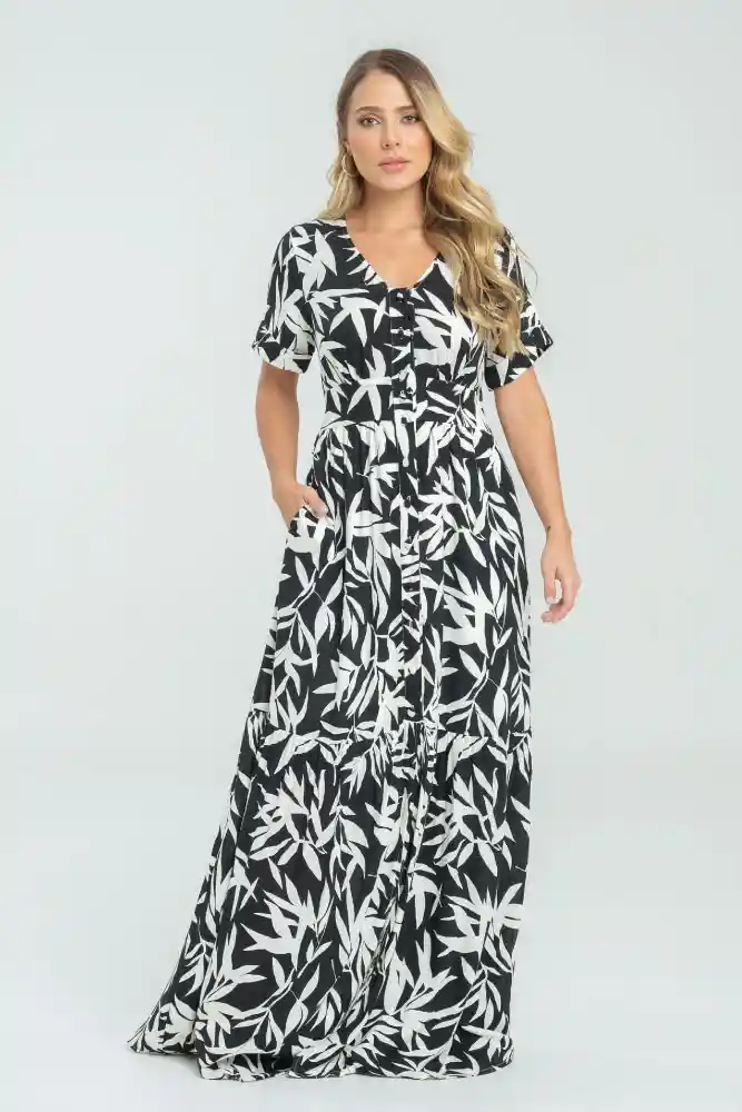 Vestido largo en tejido plano estampado, escote en V con sesgo asentado, guardapolvo con pespuntes en el ruedo de la manga corta, perilla en centro frente con botón forrado, corte bajo en el busto y cintura tanto en delantero como en trasero.