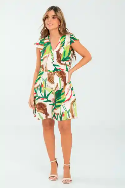 En Tejido Plano Estampado Escote en V Manga Tipo Casquito Perilla Incluida en Centro Delantero Con Botones 28L Pinzas en Delantero y Posterior Cortes en Laterales de la Blusa Forro Interno.