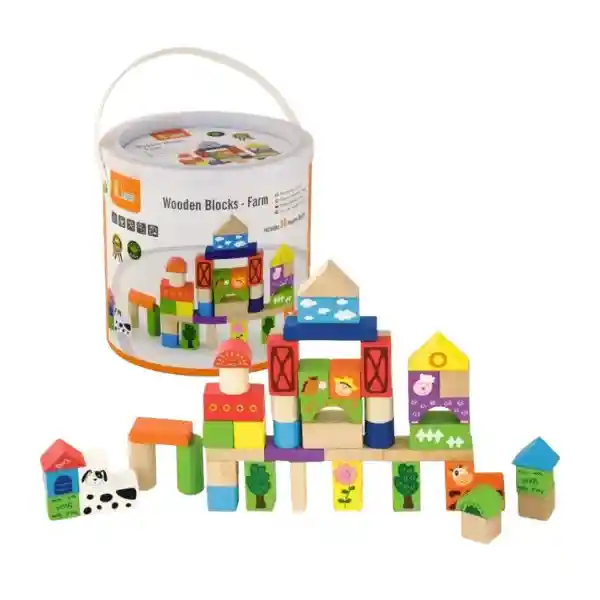 Contiene 50 Piezas. Cubo Con 50 Bloques de Madera Con Ilustraciones de Granja (Animales Edificios Cercas Etc.). Ideal Para Construir Escenas Rurales y Mezclar Con Otras Piezas de Construcción.