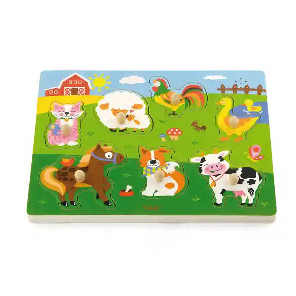 Contiene 7 Piezas. Puzzle de Madera Con Animales de Granja Cada Figura al Colocarse Correctamente Activa el Sonido Correspondiente. Pensado Para Primeros Conceptos de Animales y Juego Sensorial Desde 18 Meses.