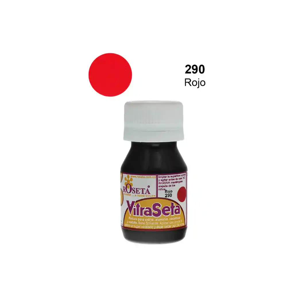"Pintura transparente para vidrio, acetato, acrílicos, cerámica, madera y aluminio. Color 290 Rojo. Antes de aplicar la superficie debe estar libre de grasa, polvo y cualquier partícula extraña. Aplique con pincel, brocha, gotero o aerógrafo. Colores mezclables entre sí para obtener más tonos. Aplicado sobre cerámica o madera da un acabado brillante."