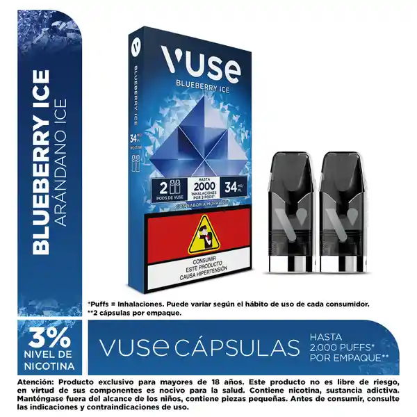 Atención: Este Producto no es Libre de Riesgo, en Virtud de Sus Componentes es Nocivo Para la Salud. Contiene Nicotina, Sustancia Adictiva. Manténgase Fuera Del Alcance de Los Niños, Contiene Piezas Pequeñas. Antes de Consumir, Consulte Las Indicaciones y Contraindicaciones de Uso. Desde el 21 de Julio de 2025 Productores e Importadores Estarán Obligados a Comercializar Sus Productos Con Los Pictogramas y Advertencias Sanitarias Establecidas Por el Ministerio de Salud. Por lo Anterior, Coexistirán en Los Puntos de Venta y/o Entregas a Domicilio Empaques de Producto Con o Sin Advertencia Sanitaria, Hasta Que Estos Últimos Sean Comercializados en su Totalidad. La Presente Comunicación se Publica en Cumplimiento de lo Dispuesto en Los Artículos 3 (Numeral 1.3) y 23 a 28 Del Estatuto Del Consumidor (Ley 1480 de 2011), Suministra Información Clara, Suficiente, Veraz y Oportuna. El Contenido Aquí Publicado no Tiene Fines Promocionales ni Publicitarios. Ingredientes: Glicerina Vegetal, Propilenglicol, Saborizante Artificial de Mora Azul, Nicotina (Sustancia Adictiva y Nociva Para la Salud), Ácido Láctico, Agua, Alcohol Bencílico, Furaneol, Piperonal y Damascenona (Beta-). Empaque Con 2 Pods de Vuse. Cont. Net. De Cada Pod: 2 ml. De Líquido Vaporizable. Contenido de Nicotina Por mL de Líquido Vaporizable: 34 Miligramos Por Mililitro, Equivalente al 3% Del Contenido Neto Del Pod.