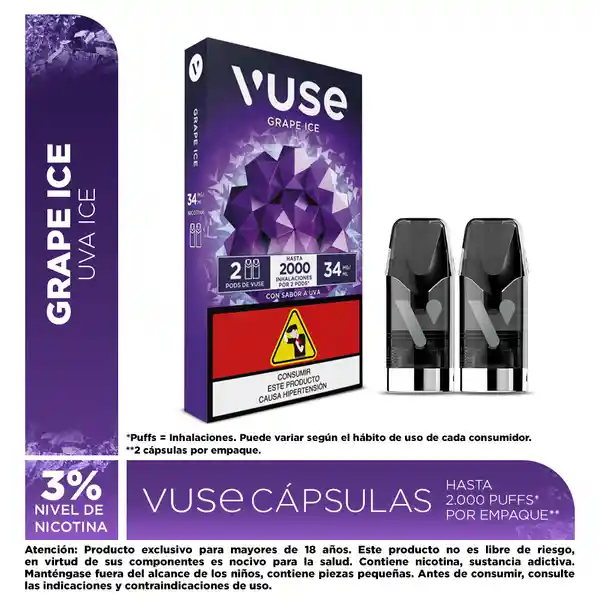 Atención: Este Producto no es Libre de Riesgo, en Virtud de Sus Componentes es Nocivo Para la Salud. Contiene Nicotina, Sustancia Adictiva. Manténgase Fuera Del Alcance de Los Niños, Contiene Piezas Pequeñas. Antes de Consumir, Consulte Las Indicaciones y Contraindicaciones de Uso. Desde el 21 de Julio de 2025 Productores e Importadores Estarán Obligados a Comercializar Sus Productos Con Los Pictogramas y Advertencias Sanitarias Establecidas Por el Ministerio de Salud. Por lo Anterior, Coexistirán en Los Puntos de Venta y/o Entregas a Domicilio Empaques de Producto Con o Sin Advertencia Sanitaria, Hasta Que Estos Últimos Sean Comercializados en su Totalidad. La Presente Comunicación se Publica en Cumplimiento de lo Dispuesto en Los Artículos 3 (Numeral 1.3) y 23 a 28 Del Estatuto Del Consumidor (Ley 1480 de 2011), Suministra Información Clara, Suficiente, Veraz y Oportuna. El Contenido Aquí Publicado no Tiene Fines Promocionales ni Publicitarios. Ingredientes: Glicerina Vegetal, Propilenglicol, Saborizante Artificial de Uva, Nicotina (Sustancia Adictiva y Nociva Para la Salud), Ácido Láctico, Agua, Alcohol Bencílico, Furaneol y Piperonal. Empaque Con 2 Pods de Vuse. Cont. Net. De Cada Pod: 2 ml. De Líquido Vaporizable. Contenido de Nicotina Por mL de Líquido Vaporizable: 34 Miligramos Por Mililitro, Equivalente al 3% Del Contenido Neto Del Pod.