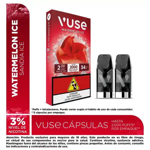 Atención: Este Producto no es Libre de Riesgo, en Virtud de Sus Componentes es Nocivo Para la Salud. Contiene Nicotina, Sustancia Adictiva. Manténgase Fuera Del Alcance de Los Niños, Contiene Piezas Pequeñas. Antes de Consumir, Consulte Las Indicaciones y Contraindicaciones de Uso. Desde el 21 de Julio de 2025 Productores e Importadores Estarán Obligados a Comercializar Sus Productos Con Los Pictogramas y Advertencias Sanitarias Establecidas Por el Ministerio de Salud. Por lo Anterior, Coexistirán en Los Puntos de Venta y/o Entregas a Domicilio Empaques de Producto Con o Sin Advertencia Sanitaria, Hasta Que Estos Últimos Sean Comercializados en su Totalidad. La Presente Comunicación se Publica en Cumplimiento de lo Dispuesto en Los Artículos 3 (Numeral 1.3) y 23 a 28 Del Estatuto Del Consumidor (Ley 1480 de 2011), Suministra Información Clara, Suficiente, Veraz y Oportuna. El Contenido Aquí Publicado no Tiene Fines Promocionales ni Publicitarios. Ingredientes: Glicerina Vegetal, Propilenglicol, Saborizante Artificial de Sandía, Nicotina (Sustancia Adictiva y Nociva Para la Salud), Ácido Láctico, Agua, Alcohol Bencílico, Furaneol y Linalool. Empaque Con 2 Pods de Vuse. Cont. Net. De Cada Pod: 2 ml. De Líquido Vaporizable. Contenido de Nicotina Por mL de Líquido Vaporizable: 34 Miligramos Por Mililitro, Equivalente al 3% Del Contenido Neto Del Pod.
