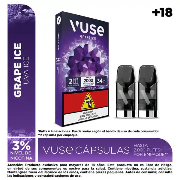 Atención: Producto exclusivo para mayores de 18 años Este producto no es libre de riesgo, en virtud de sus componentes es nocivo para la salud. Contiene nicotina, sustancia adictiva. Manténgase fuera del alcance de los niños, contiene piezas pequeñas. Antes de consumir, consulte las indicaciones y contraindicaciones de uso. Desde el 21 de julio de 2025 productores e importadores estarán obligados a comercializar sus productos con los pictogramas y advertencias sanitarias establecidas por el Ministerio de Salud. Por lo anterior, coexistirán en los puntos de venta y/o entregas a domicilio empaques de producto con o sin advertencia sanitaria, hasta que estos últimos sean comercializados en su totalidad. La presente comunicación se publica en cumplimiento de lo dispuesto en los artículos 3 (numeral 1.3) y 23 a 28 del Estatuto del Consumidor (Ley 1480 de 2011), suministra información clara, suficiente, veraz y oportuna. El contenido aquí publicado no tiene fines promocionales ni publicitarios.Ingredientes: glicerina vegetal, propilenglicol, saborizante artificial de uva, nicotina (sustancia adictiva y nociva para la salud), ácido láctico, agua, alcohol bencílico, furaneol y piperonal. Empaque con 2 Pods de Vuse. Cont. Net. de cada pod: 2 ml. de líquido vaporizable. Contenido de nicotina por ml de líquido vaporizable: 34 miligramos por mililitro, equivalente al 3% del contenido neto del pod.