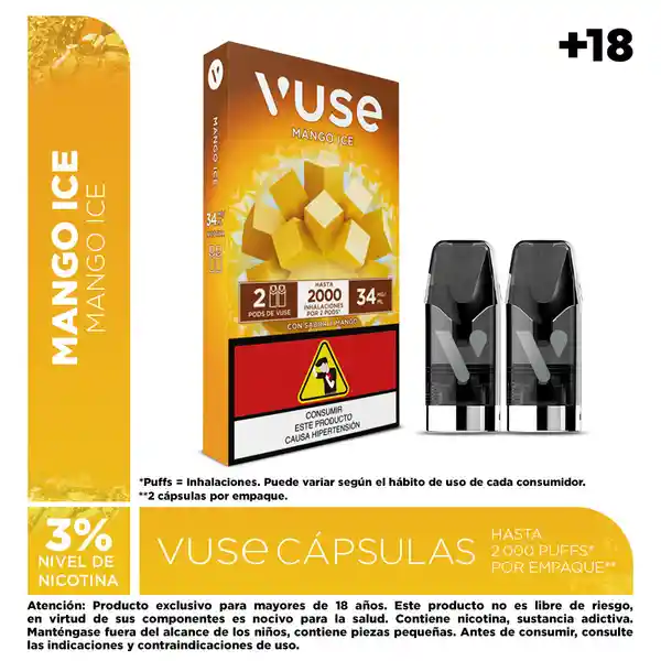 Atención: Producto exclusivo para mayores de 18 años Este producto no es libre de riesgo, en virtud de sus componentes es nocivo para la salud. Contiene nicotina, sustancia adictiva. Manténgase fuera del alcance de los niños, contiene piezas pequeñas. Antes de consumir, consulte las indicaciones y contraindicaciones de uso. Desde el 21 de julio de 2025 productores e importadores estarán obligados a comercializar sus productos con los pictogramas y advertencias sanitarias establecidas por el Ministerio de Salud. Por lo anterior, coexistirán en los puntos de venta y/o entregas a domicilio empaques de producto con o sin advertencia sanitaria, hasta que estos últimos sean comercializados en su totalidad. La presente comunicación se publica en cumplimiento de lo dispuesto en los artículos 3 (numeral 1.3) y 23 a 28 del Estatuto del Consumidor (Ley 1480 de 2011), suministra información clara, suficiente, veraz y oportuna. El contenido aquí publicado no tiene fines promocionales ni publicitarios.Ingredientes: glicerina vegetal, propilenglicol, saborizante artificial de mango, nicotina (sustancia adictiva y nociva para la salud), ácido láctico, agua, alcohol bencílico, piperonal, furaneol y hexenal (2-). Empaque con 2 Pods de Vuse. Cont. Net. de cada pod: 2 ml. de líquido vaporizable. Contenido de nicotina por ml de líquido vaporizable: 34 miligramos por mililitro, equivalente al 3% del contenido neto del pod.