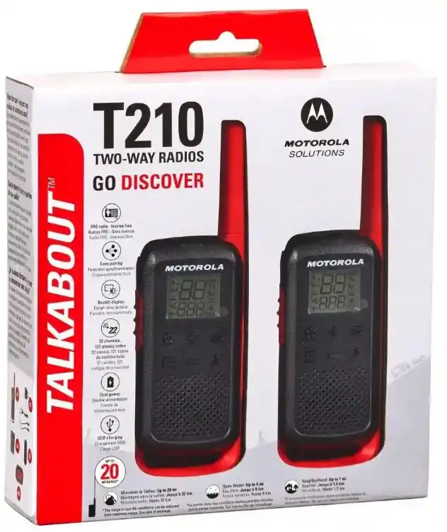Resistente y con estilo, el radio de dos vías TALKABOUT T210 es la manera de mantenerse conectado durante actividades al aire libre. Ideal para caminatas, campings, festivales o en el hogar. Cuenta con un botón de emparejamiento simplificado y carga USB para practicidad. Cumple con los requisitos FRS para el uso sin licencia e incluye pantalla retroiluminada. Características: - FRS – no requiere licencia - 22 canales y 121 códigos de privacidad - Función de llamadas de grupo con emparejamiento simplificado - Pantalla LCD retroiluminada - Pegatinas para personalización - Potencia dual – baterías alcalinas AA estándar o baterías NiMH recargables (incluidas) - Carga USB - Indicador de nivel de batería El TALKABOUT T210 ofrece comunicación accesible para la familia activa. Con funciones completas, es resistente y elegante. El botón de emparejamiento fácil facilita la configuración y con la carga USB, se puede encender de manera conveniente. También es libre de licencia e incluye pantalla LCD y 22 canales. Aspectos destacados del Motorola Talkabout T210: - Emparejamiento fácil - Potencia dual - Radio FRS - sin licencia - Carga USB - Manos libres iVOX / VOX - Pantalla retroiluminada - 22 canales más 121 códigos de privacidad Características de la gama: - De montaña a valle: hasta 20 millas - Aguas abiertas: hasta 5 millas - Vecindario: hasta 1 milla El rango en condiciones de la vida real se puede reducir desde el rango máximo. Características de presentación: - Paquete recargable de NiMH (incluido) - NiMH 800 mAH (incluido) - hasta 18 horas ** - 3 pilas alcalinas AA (opcional): hasta 45 horas ** - Cargador micro USB (incluido) - Radios FRS sin licencia - Emparejamiento fácil para llamadas grupales - Escanear / monitorear - Manos libres iVOX / VOX - Temporizador de tiempo muerto - Silenciador automático - Bloqueo de teclado - Indicador de nivel de batería - Reloj dual - Conector para auriculares de 2,5 mm - 20 tonos de llamada El rango de comunicación indicado se calcula en condiciones óptimas, con una línea de visión sin obstáculos. El alcance real variará según el terreno y las condiciones y, a menudo, menos del máximo posible. Su alcance real estará limitado por varios factores, incluidos, entre otros, el terreno, las condiciones climáticas, la interferencia electromagnética y las obstrucciones.