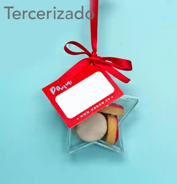Adorno de estrella de 8cm rellena de 6 galletas de 2.5 cm para perros. Marca Wawaw, distribuida por Rappi.