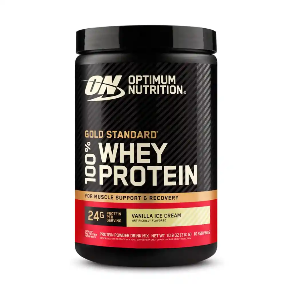 Proteína Whey gold standard de Optimum Nutrition La proteína de suero de leche más vendida en todo el mundo 🥇 ✅ 5,5 g de BCAA’s naturales por servicio para mejor recuperación y resistencia. ✅ 24 g de proteína por servicio para ayudar a desarrollar y mantener los músculos. ✅ Registro Invima Gold Standard 100% Whey Protein 10 Serv, elegida como la mejor proteína durante 10 años consecutivos. OPTIMUM NUTRITION ha elevado el estándar por el cual todas las proteínas son valoradas. Por eso, pone el listón aún más alto con la tercera generación de ON 100% WHEY. Disfruta de esta compacta presentación de 10 servicios para mayor practicidad y comodidad, ahora puedes llevar tu proteína a cualquier lugar y en todo momento. Contiene una mezcla exclusiva de: Aislado de proteína de suero microfiltrada. Aislado de proteína de suero por intercambio iónico. Concentrado de proteína de suero ultrafiltrada. Péptidos de suero hidrolizado HydroWhey. Esta la nueva vuelta de “tuerca” de OPTIMUM NUTRITION. Una considerable mejora para perfeccionar la proteína de aislado de suero que ha revolucionado el mercado americano y europeo, con millones de clientes satisfechos. Los aislados de proteína de suero son el 90% de pura proteína por peso. Esta es la más pura y cara forma de proteína que existe. Este es el ingrediente que puedes leer en la etiqueta. El aislado de suero (protein isolate) es la fuente primaria de GOLD STANDARD 100% WHEY PROTEIN con 24 gramos de esta proteína creadora de masa muscular por toma. Con menos grasa, colesterol, lactosa y otras sustancias que no deseas. Ventajas Gold Standard 100% Whey: Más aislado de proteína de suero, la fuente más pura y costosa de proteína de suero disponible en el mercado. Mayor porcentaje de proteína, siendo GOLD STANDARD 100% WHEY PROTEIN 10 SERV líder en ese aspecto, con 24 gramos de proteína por toma, ¡siendo el 79% de peso de la toma! Se han añadido más hidrolizados de péptidos de suero HYDROWHEY© que al ser de menor peso molecular son más asimilables. Contiene lactasas y otras enzimas digestivas como la mezcla patentada que realza la absorción y es apta para los intolerantes a la lactosa. Se disuelve instantánea y fácilmente con una cuchara o pocas agitaciones de tu mezclador. Cada servicio incluye más fracción de proteína de suero biológicamente activo como alfa-lactoalbúminas, glicomacropéptidos, beta-lactoglobulinas, inmunoglobulina G, lactoferrinas, lacto peroxidasas, y varios activadores del crecimiento. Contiene 4 gramos de glutamina y precursores. También contiene 5 gramos de BCAA’s (aminoácidos ramificados: Leucina, Isoleucina, y Valina) en cada toma. Recomendaciones de uso: para obtener un balance positivo de nitrógeno, consume aproximadamente 2 gramos de proteína por kg de peso corporal totales al día, combinando alimentos ricos en proteína y más el batido de proteína GOLD STANDARD 100% WHEY. Para obtener mejores resultados, tomar las dosis de proteína repartidas en 4-6 pequeñas comidas durante todo el día.