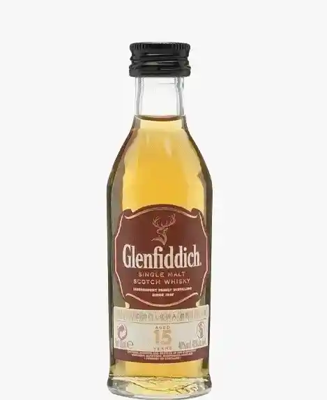 Whisky Glenfiddich 15 Años 50 ml Single Malt Scotch Whisky madurado mediante el sistema Solera. De perfil suave y complejo, con notas de miel, frutas maduras, vainilla y especias. Final largo y equilibrado, ideal para disfrutar solo o con hielo, en práctico formato mini.