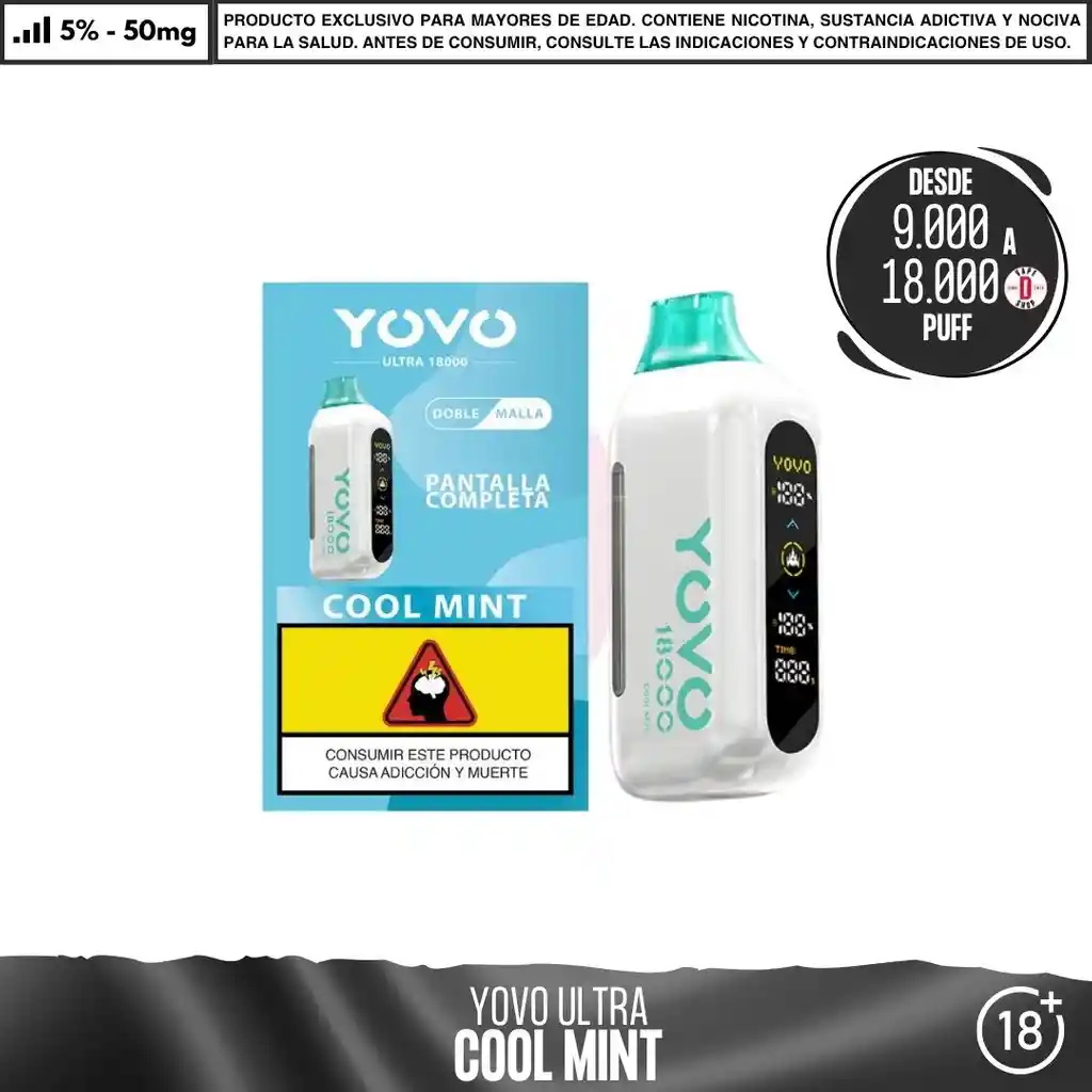 Yovo - Ultra  9000 a 18000 Puffs Disfruta de tu vape desechable visualizando el contenido de e-líquido restaurante en tu dispositivo. Yovo Ultra experiencia única.  Contenido del paquete: 1 dispositivo desechable Concentración de nicotina:  18000 PUFF -  5 % de nicotina salina en peso  Características del dispositivo: Dispositivo de vapeo desechable 15 ml de capacidad 1 dispositivo por paquete 9000 a 18000 caladas aproximadamente (según modo de uso). Sabores Disponibles Cool Mint 🧊 Watermelon Ice 🍉 Alphonso Mango 🥭 Berry Mix 🍓🫐 Blue Razz Ice 🔵 Grape Gami 🍇 Peach Orange Pineapple 🍑🍊🍍 Strazz 🍓🍓 Ingredientes: Glicerina Vegetal, Propilenglicol, Aromatizantes Naturales y Artificiales, Ácido Benzoico, Nicotina. Advertencia: Contiene nicotina, que puede ser venenoso. Evitar el contacto con la piel y los ojos. No ingerir. Mantener siempre en empaque original y en un ambiente fresco y seco. Mantener alejado de niños y mascotas. No debe utilizarse por Mujeres en estado de embarazo o personas con problemas de respiración como el asma. En caso de accidente contacte a la línea 123.