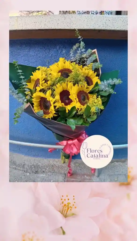 Hermosos girasoles que irradian luz, alegría y vitalidad, símbolos de felicidad y energía positiva. Un arreglo lleno de color y frescura, perfecto para iluminar cualquier espacio y celebrar los momentos más especiales. 10 Girasoles, follajes, envoltura, moño fino y globito